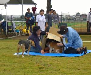 ワンちゃん飼い主さん ゲートをジャンプし仲良く段ボールをくぐり、ポールを